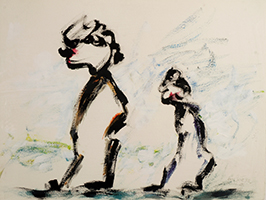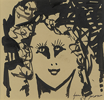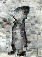 Après cette recherche de l’accident ou dominent le noir et le blanc dans un entrelacement de taches amenuisées en filets La tache en mouvement, 1982 Frère Jérôme délaisse cet accident par le geste et part à l’exploration de la tache pour l’euphorie de la forme et de la couleur. Il réalise un impressionnant corpus d’œuvres sous la thématique du jardin dont le mouvement d’ensemble très voluptueux confirme que l’homme et le peintre sont à l’aube « des jours heureux ». Les formes nouées comme des gerbes Aspiration,1985 flottent dans l’espace au gré des taches, des couleurs, des textures dans une sorte de confusion picturale où les variantes visuelles laissent toute la place à l’imaginaire du spectateur. À la faveur de ses soixante dix ans de pratique picturale Frère Jérôme a joué un rôle de passeur : passeur de la beauté, passeur de la témérité, passeur de la compassion, passeur de l’humour, passeur de l’anecdote. Ce rôle de passeur est abondamment illustré dans une immense galerie de personnages dont les héros sont nés au début des années cinquante. Sans titre, 1959 En examinant bien ce corpus on a l'impression de feuilleter un album de famille. Chaque tableau raconte une histoire vécue, politique, imaginaire, tragique, poétique. Piquet de grève,1989, Nous y voilà, 1989, Dans une sorte de suspens fantomatique mais dans l’équilibre de la forme, Frère Jérôme met en scène une faune humaine habitée par l’angoisse et le mal de vivre. Les protagonistes de ce théâtre sont courbés, enfermés dans des vêtements couleur d’abandon et de mélancolie. Ils marchent sur une surface incertaine, enfoncés dans une terre sans cesse remuée dont leurs sabots ont du mal à s’extraire, Sans titre, 1991. Frère Jérôme en a fait des figures de soumission et d’isolement en les priant de raconter leurs histoires au monde entier afin qu’un jour les hommes et les femmes vivent dans la lumière, délivrés de toute tristesse agrippée aux pieds.