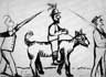 La mission spécifique desFrères de Sainte-Croix étant l'enseignement, le frère Jérôme se prépare à ce métier entre 1918 et 1921 alors qu'il obtient le certificat modèle bilingue d'enseignement, bureau des examinateurs catholiques de la province de Québec. Pendant tout près de trente ans, il occupera des postes de professeur et de surveillant de jeux dans les institutions de sa communauté. Tour à tour professeur régulier depuis le cours préparatoire jusqu'à la sixième année, professeur de français, de religion, de dessin, sa vie entière est consacrée aux jeunes. Sous la recommandation de Gérard Morisset, directeur de l'enseignement du dessin pour la province de Québec, la communauté de Sainte-Croix retient les services de Borduas en 1941 pour assister le frère Jérôme dans ses tâches d'éducateur. Borduas possède une bonne expérience professorale puisqu'il enseigne déjà le «dessin à vue» aux élèves de la commission scolaire catholique de Montréal. Une amitié et une complicité sans précédent naissent entre les deux hommes abolissant toute hiérarchie dans le travail. Borduas et Paradis défendent un enseignement non plus basé sur l'académisme mais sur la sensibilité, l'authenticité et la spontanéité des enfants. Paradis n'exige pas que les travaux des élèves soient figuratifs ou abstraits; il exige qu'ils soient vrais. Dans ses notes, il explique que la «seule intention de faire une oeuvre d'art suffit à tout gâcher(1).» «On va commercer à barbouiller en profondeur. De grâce, puisez au plus profond de vous-même, le plus gauchement, le plus enfantin(2).» «Le pire ennemi de l'artiste ou du créateur, c'est le souvenir. A mes élèves, je demande d'abord de barbouiller une feuille de papier ou simplement de la salir. Cela afin de nettoyer les souvenirs, notamment ceux de l'enseignement acquis avant même d'avoir appris à s'exprimer(3).» Paradis enseigne la vie à la faveur du dessin et de la peinture. Afin que les étudiants prennent conscience du vaste potentiel de création présent en chacun, il rédige un programme spécifique à l'enseignement des arts pour chaque semaine de l'année scolaire(4). Quelques fois au cours de l'année, il organise des expositions de travaux d'enfants et d'adultes. Il multiplie les révisions collectives (maître-superviseur-élèves). L'enseignement des arts plastiques occupe la majeure partie de sa vie professionnelle. Dès 1940, son besoin de renouveler le modèle pédagogique se heurte aux mêmes difficultés que son métier de peintre. Le programme officiel de l'enseignement des arts stipule clairement que «les élèves doivent donner des représentations fidèles du modèle.» Paradis demande que «les élèves donnent des représentations personnelles du modèle (5).» Les éloges et les critiques pleuvent. Les plus enthousiastes parlent d'un «événement important et de conception nouvelle du dessin pour le Canada.» «Désormais il y aura, au moins en quelques endroits de notre province, des êtres prêts à la grande conquête d'eux-mêmes et de la vie. Des enfants - souhaitons-les de plus en nombreux - car cette nécessité est pressante (6).» Les détracteurs pour leur part considère que «cette forme d'enseignement entraîne les enfants dans une voie qui mène directement à la folie (7).» Ils déplorent que «l'enseignement des arts plastiques s'associe à des caricatures de l'art tel le cubisme, l'impressionnisme et le surréalisme (8).» L'importance de la pédagogie du frère Jérôme est par contre reconnue dans les hauts lieux de l'enseignement et on lui demande de former de nouveaux professeurs. Il est invité à donner des cours spéciaux aux professeurs de différents niveaux. Il enseigne à l'École des beaux-arts de Montréal à titre de professeur à temps partiel. Il supervise des animateurs à son atelier. Puis, en 1967, on sollicite sa participation à la Commission d'enquête sur l'enseignement des arts au Québec (Commission Rioux). Son rapport introduit sa propre philosophie en enseignement des arts plastiques, philosophie inspirée de l'expression libre de la personne. De plus, Paradis précise l'importance du rôle de l'artiste dans la société contemporaine, rôle qui doit en être un de renouvellement et d'humanisation(9). __________________(1) Robert Dubuc, «L'authentique en peinture», Le Devoir, mardi 10 mai 1994. (2) «Vous exprimer? Vous défouler? Allez à l'atelier du frère Jérôme», Le Dimanche/Dernière heure, 21 septembre 1969 (article non signé). (3) Gilles Normand, «Trois dépressions profondes, trois grandes époques», La Presse, le samedi 26 mars 1983, pages D-10, D-14. (4) Document de travail personnel à Paradis titré Méthodologie du dessin et daté 1957. Archives des Frères de Sainte-Croix. (5) Anne Lauzon, Le frère Jérôme : son cheminement pédagogique et l'élaboration de son modèle éducatif, Mémoire de maîtrise présenté à l'UQAM, novembre 1988, page 61. (6) Maurice Gagnon, attaché honoraire des Musées nationaux de France, Le Collégien, 1942. (7) Lettre du gérant d'une des principales maisons d'affaires de Montréal au supérieur du Collège Notre-Dame, le 22 juillet 1944. Archives des Frères de Sainte-Croix. (8) J.O.C. Linch, document daté de 1944. La référence au journal est absente. Archives des Frères de Sainte-Croix. (9) Jérôme Paradis, Commission d'enquête sur l'enseignement des arts, Rapport du frère Jérôme, mai 1967 (Mémoire sur l'enseignement des arts plastiques). | |